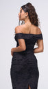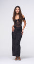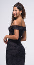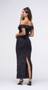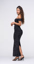 Maxi DRESS, color negro, Off Shoulder, con brillos plateados en todo el vestido, con forro por debajo, tela de poliéster mesh ,corrugado en aparte de los lados, ideal para una ocasión especial