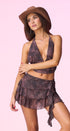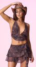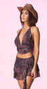 Set de Top y minifalda, color café, minifalda, con vuelos, Top, cuello de Hamaca, amarre en el cuello, espalda, abierta, ideal para un Look moderno y casual.