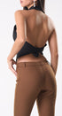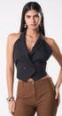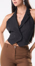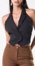 chaleco Top negro de rayitas, con cuello y botones al frente, espalda, abierta y amarre en la parte de atrás de la espalda, corte a la cintura, ideal para un Look moderno y casual