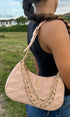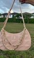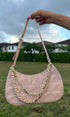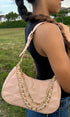 BOLSO DE HOMBRO STEVE MADDEN ROSA CLARO CON TEXTURA ACOLCHADA, DETALLE DE DOBLE CADENA DORADA Y CHARM 'SM' DORADO