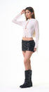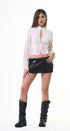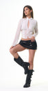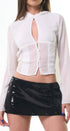Top color blanco, manga larga botones al frente con tiritas ajustables en el cuello, ya sea como bufanda o con un lazo al frente, corté las caderas, ideal para un Look moderno y casual, te la de poliéster mesh.