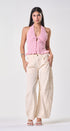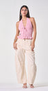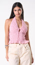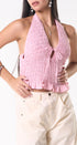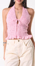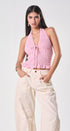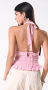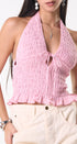 Top color rosado, cuello en V , amarre en el cuello, espalda, abierta, tela de poliéster, corrugada, corte a las caderas, ideal para un Look moderno y casual