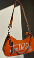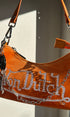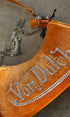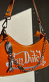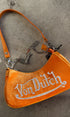 Eleva cualquier outfit con este bolso Von Dutch original en un vibrante tono naranja aterciopelado, diseñado para robar miradas. Su icónico logo Von Dutch en pedrería brillante le da ese toque Y2K glam que está full tendencia.