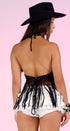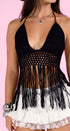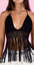 Top color negro de tejido en lana, cuello en V , barbitas al frente, amarre en el cuello atrás, Full espalda abierta, para un Look en la playa moderno y casual