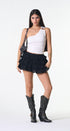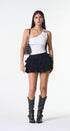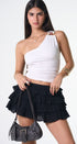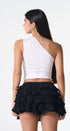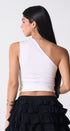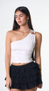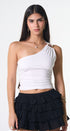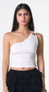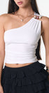 Top asimétrico, color blanco, Tela licra, Stretch, corrugado a los lados, con detalle metálico en el hombro, ideal para un Look moderno y casual