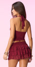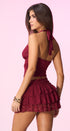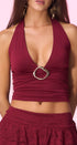 Top, color Burgundy, tela de algodón, con detalle metálico, dorado, al frente, amar en el cuello, espalda, abierta, corte, A, las caderas, ideal para un Look moderno y casual.