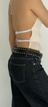 Faja de cuero negra con remachas plateados y hebilla plateada